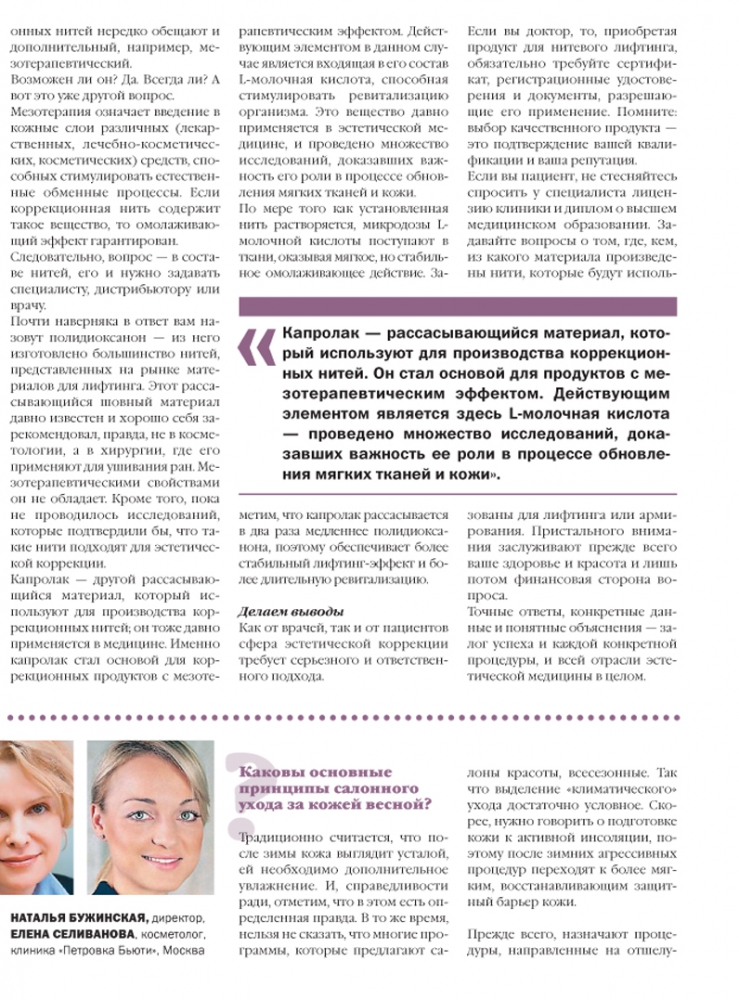 Шаг 3. Уточним состав Помимо основного лифтинг эффекта, производители коррекционных нитей нередко обещают и дополнительный, например, мезотерапевтический. Возможен ли он? Да. Всегда ли? А вот это уже другой вопрос. Мезотерапия означает введение в кожные слои различных (лекарственных, лечебно-косметических, косметических) средств, способных стимулировать естественные обменные процессы. Если коррекционная нить содержит такое вещество, то омолаживаю щий эффект гарантирован. Следовательно, вопрос — в составе нитей, его и нужно задавать специалисту, дистрибьютору или врачу. Почти наверняка в ответ вам на зовут полидиоксанон — из него изготовлено большинство нитей, представленных на рынке мате риалов для лифтинга. Этот рассасывающийся шовный материал давно известен и хорошо себя за рекомендовал, правда, не в косметологии, а в хирургии, где его применяют для ушивания ран. Мезотерапевтическими свойствами он не обладает. Кроме того, пока не проводилось исследований, которые подтвердили бы, что та кие нити подходят для эстетической коррекции. Капролак — другой рассасывающийся материал, который используют для производства коррекционных нитей; он тоже давно применяется в медицине. Именно капролак стал основой для коррекционных продуктов с мезотерапевтическим эффектом. Действующим элементом в данном случае является входящая в его состав L_молочная кислота, способная стимулировать ревитализацию организма. Это вещество давно применяется в эстетической медицине, и проведено множество исследований, доказавших важность его роли в процессе обнов ления мягких тканей и кожи. По мере того как установленная нить растворяется, микродозы L молочной кислоты поступают в ткани, оказывая мягкое, но стабильное омолаживающее действие. Заметим, что капролак рассасывается в два раза медленнее полидиоксанона, поэтому обеспечивает более стабильный лифтингэффект и более длительную ревитализацию.